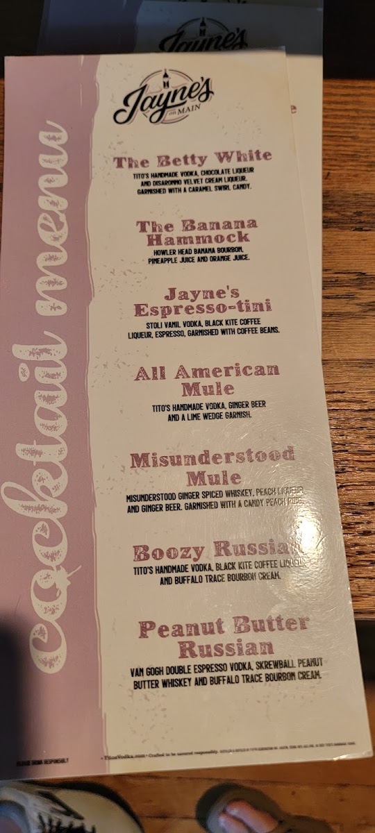 With ample choices across wines, mixed drinks, and lighter fare, Jayne’s On Main provides a setting where drinks complement the atmosphere, inviting guests to stay awhile and savor the experience at their own pace.